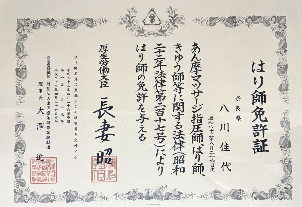 はり師きゅう師国家資格を平成22年取得。施術歴15年、女性ならではの不調の専門家。