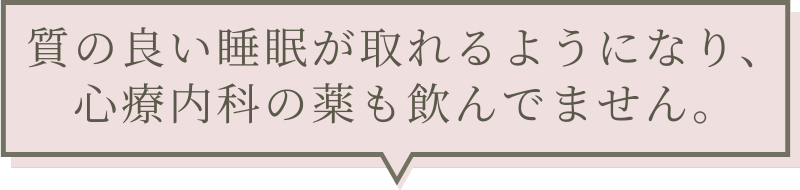 その頃から心療内科で処方された薬も飲んでません。毎回先生が丁寧な問診をしてくださり、その時の体調にあった施術をしてくれます。最近は美容鍼も受けています。フェイスラインもすっきりしてきました。