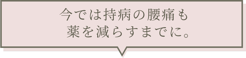 今では持病の腰痛も薬を減らすまでになり肩こりだけでなく、頭痛に眼精疲労に便秘など身体全体を診て貰って少しずつ楽になっています。施術してもらいながら話をするのも楽しく和みます。