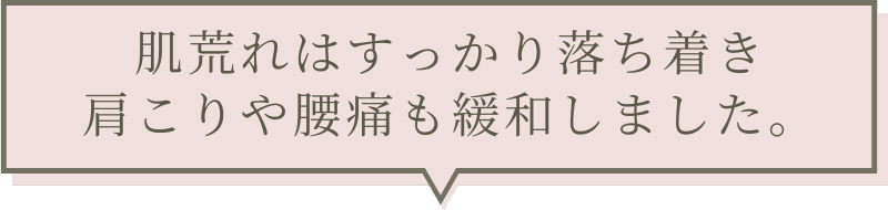 お世話になり始めたきっかけは、仕事環境が変わった時期に肌荒れや便秘、肩こり、腰痛が悪化した事だったと思います。女性専用という安心感とSNSから感じる先生の親しみやすい雰囲気に期待して伺いましたが、問診と施術の丁寧さに感動して今では体調に合わせて1〜2ヶ月に一度程度美容鍼と整体でお世話になっています。